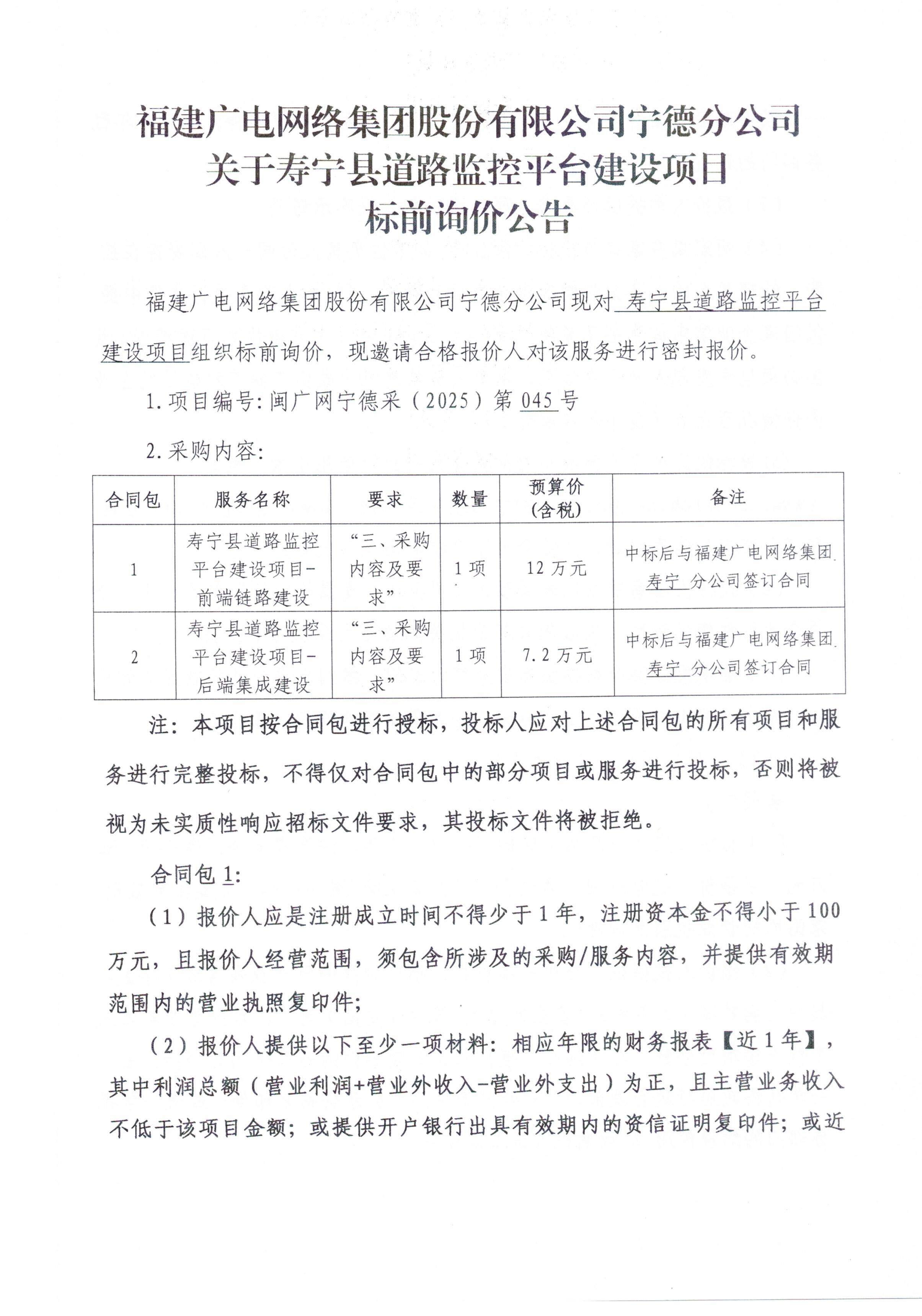 福建广电网络集团股份有限公司宁德分公司寿宁县道路监控平台建设项目