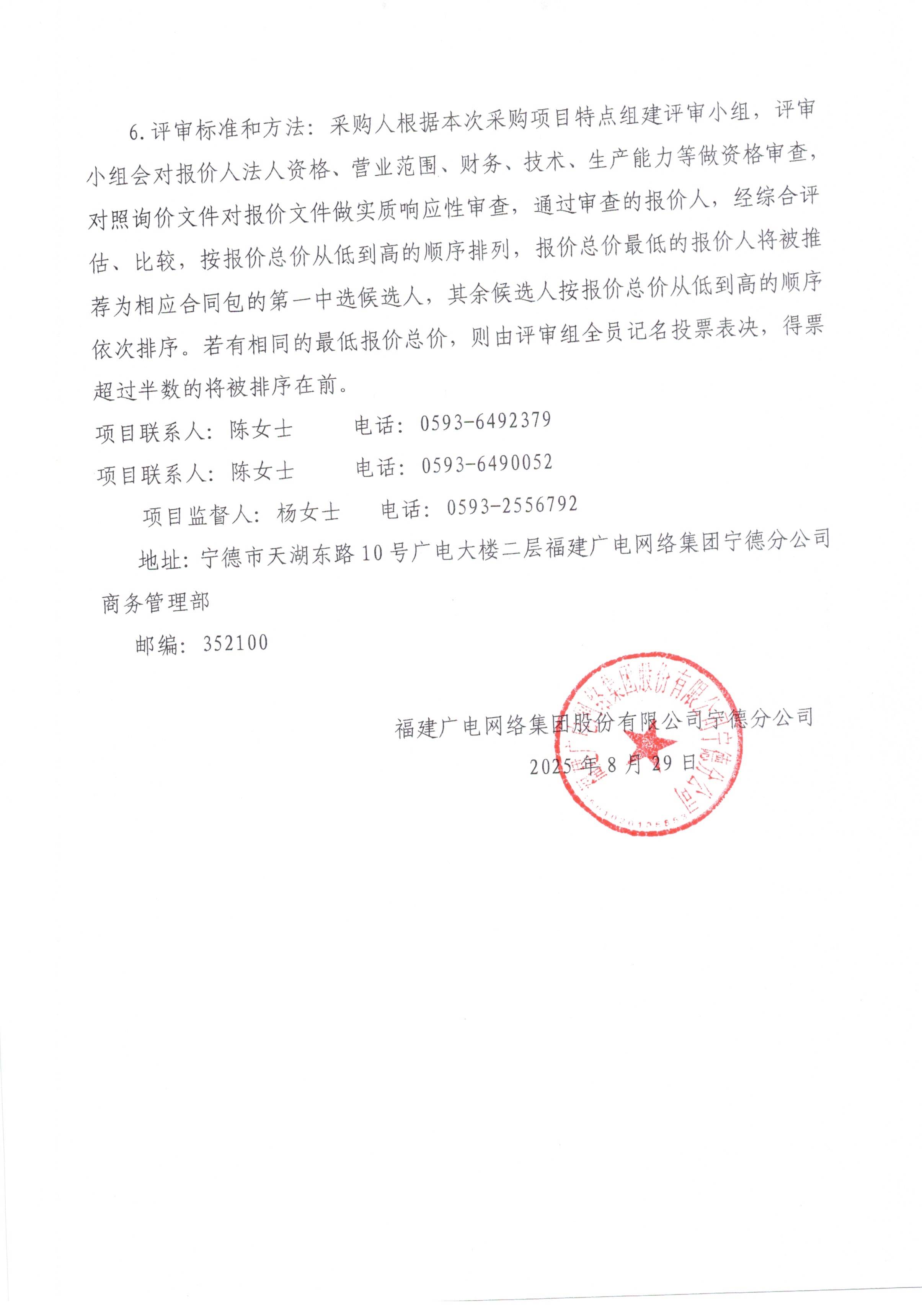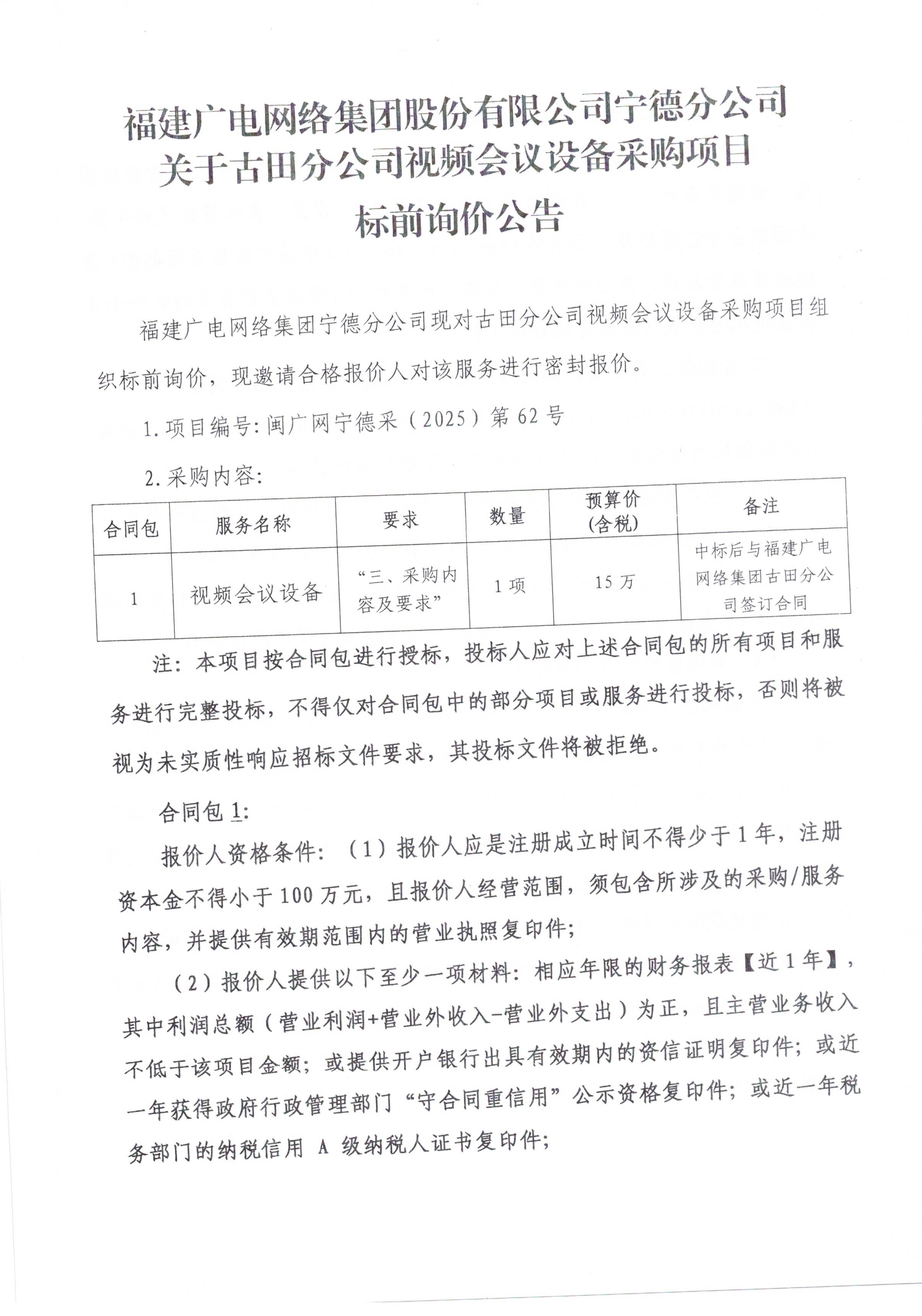 福建广电网络集团股份有限公司宁德分公司关于古田分公司视频会议设备采购项目