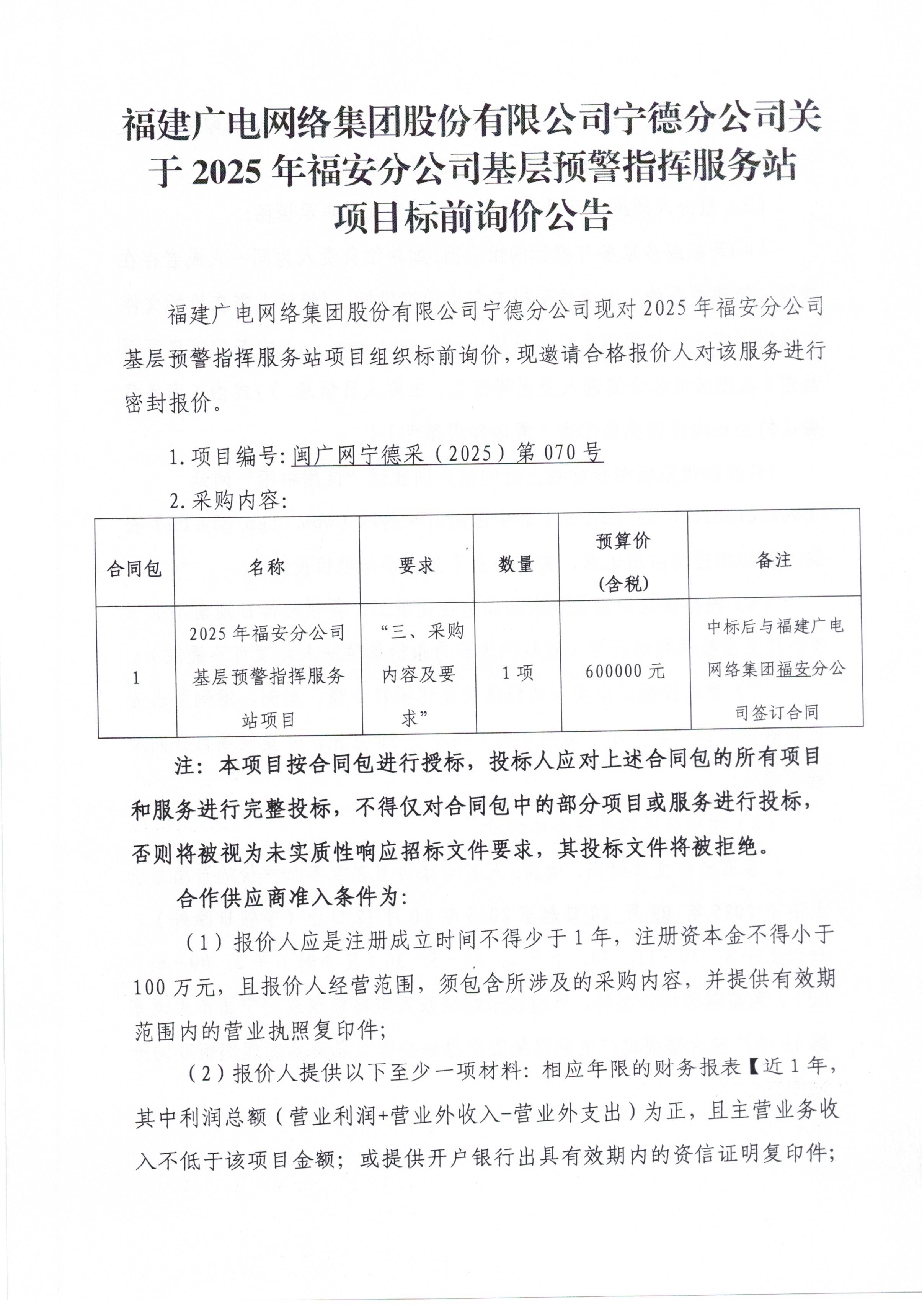 2025年福安分公司基层预警指挥服务站项目(标前询价)