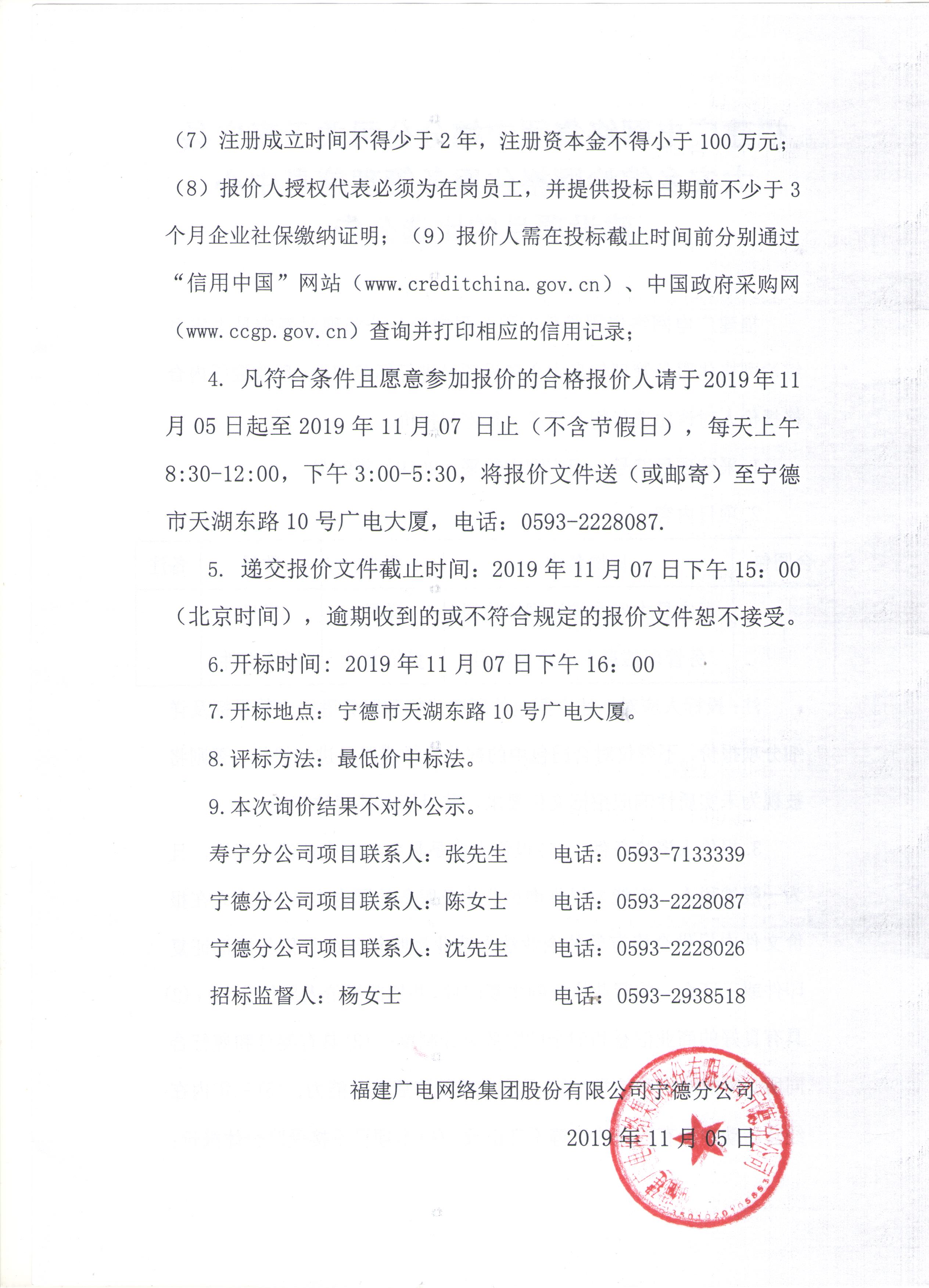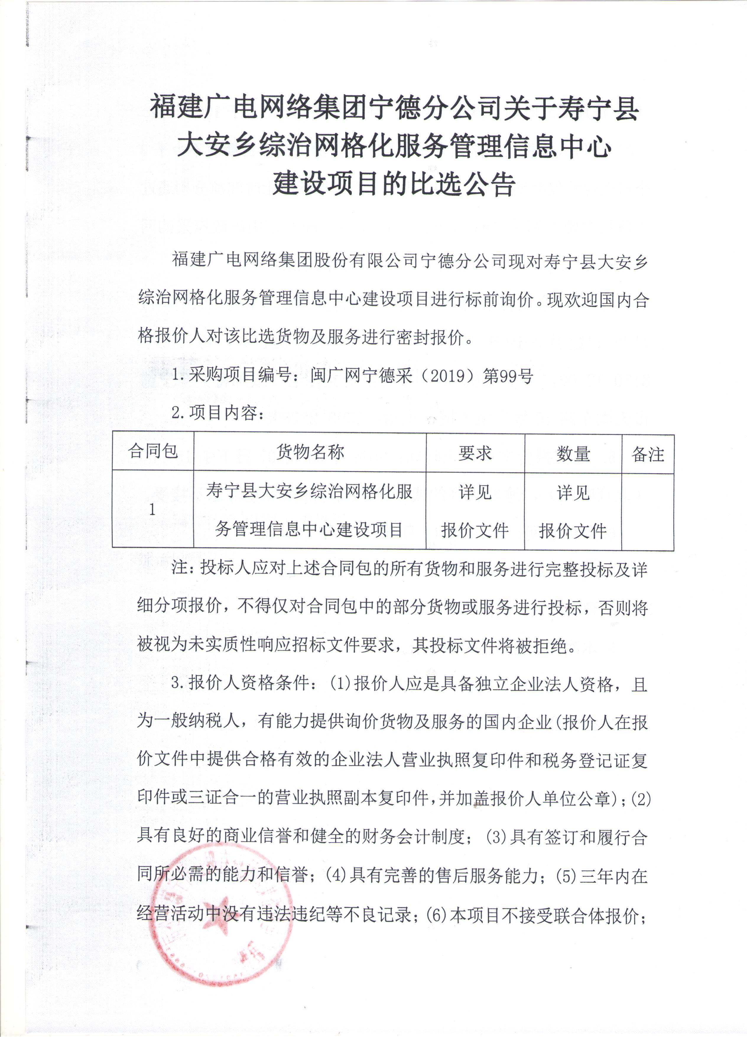 福建广电网络集团宁德分公司关于寿宁县大安乡综治网格化服务管理信息中心建设项目的比选公告