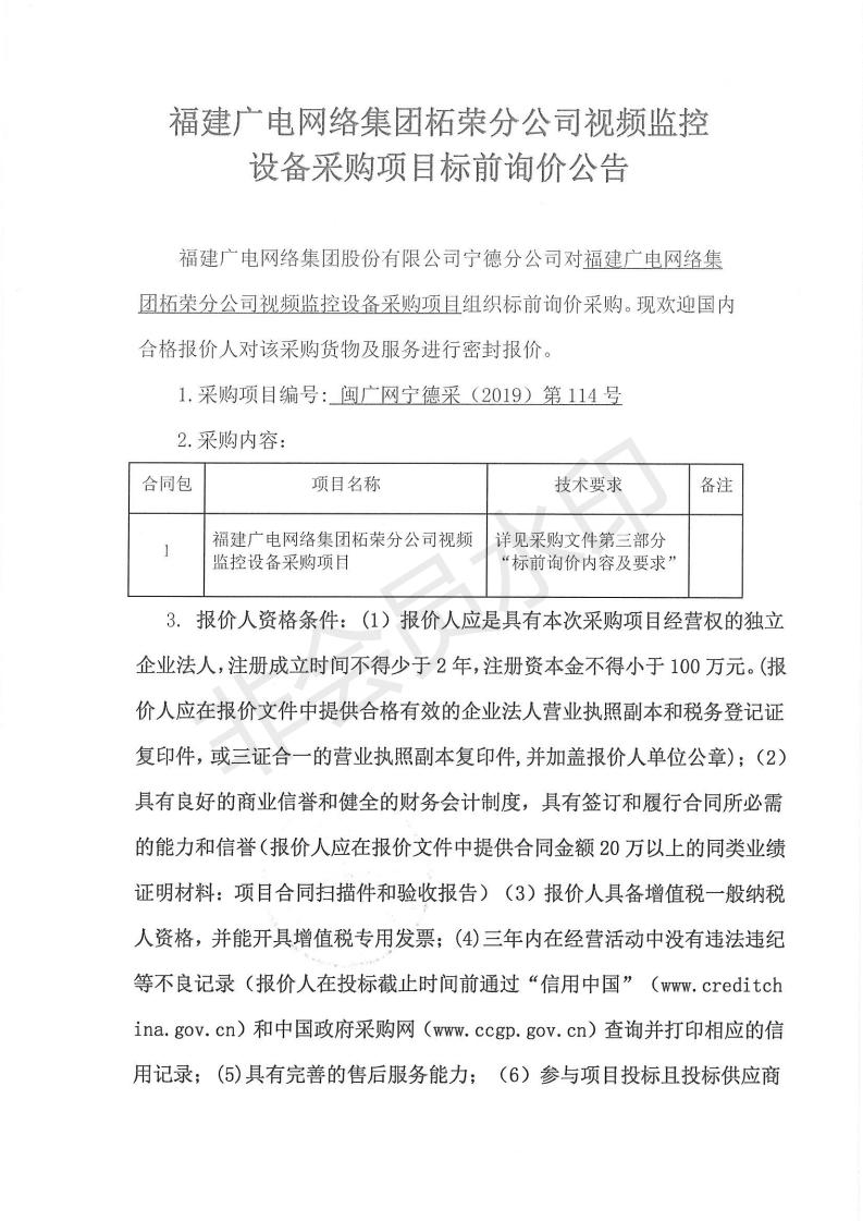 柘荣分公司视频监控设备采购项目标前询价公告