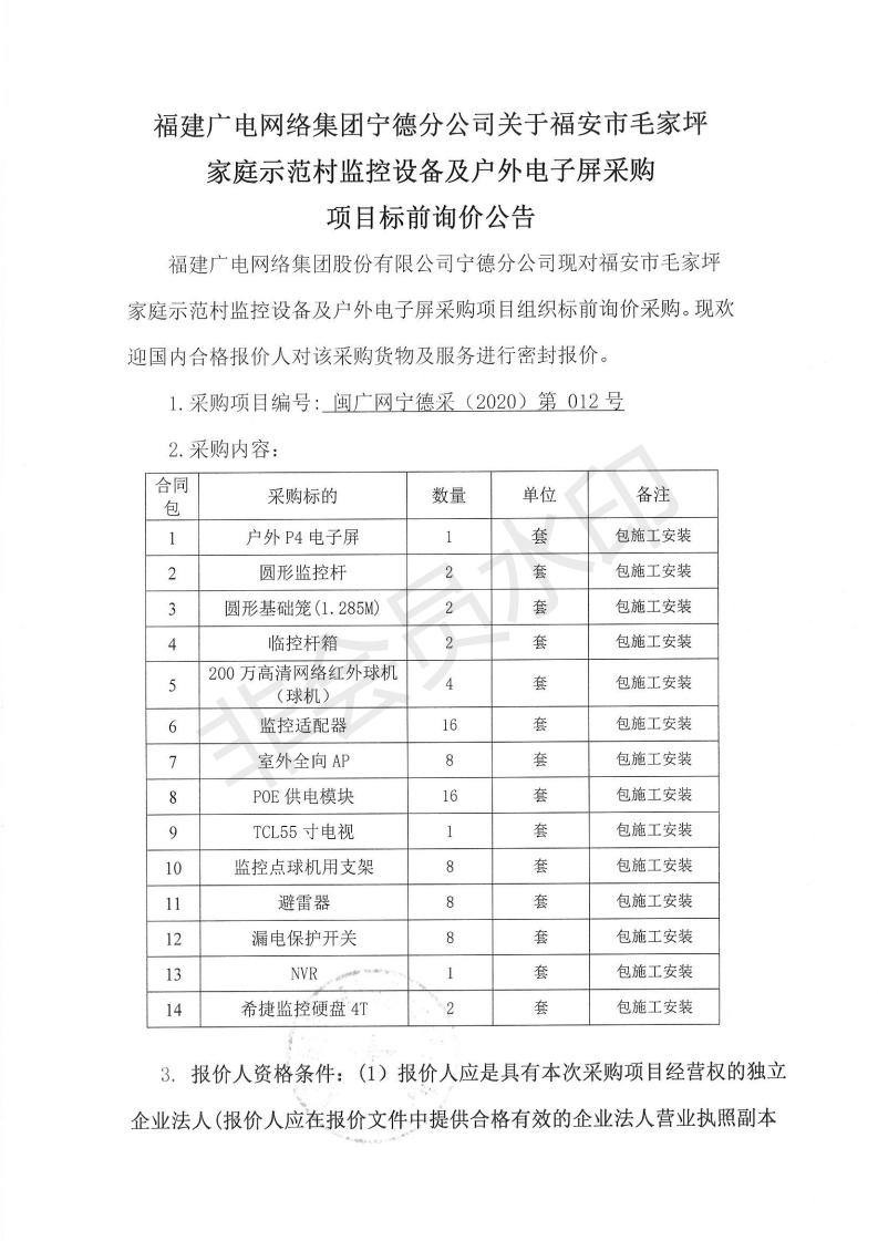 福安市毛家坪家庭示范村监控设备及户外电子屏采购项目标前询价公告