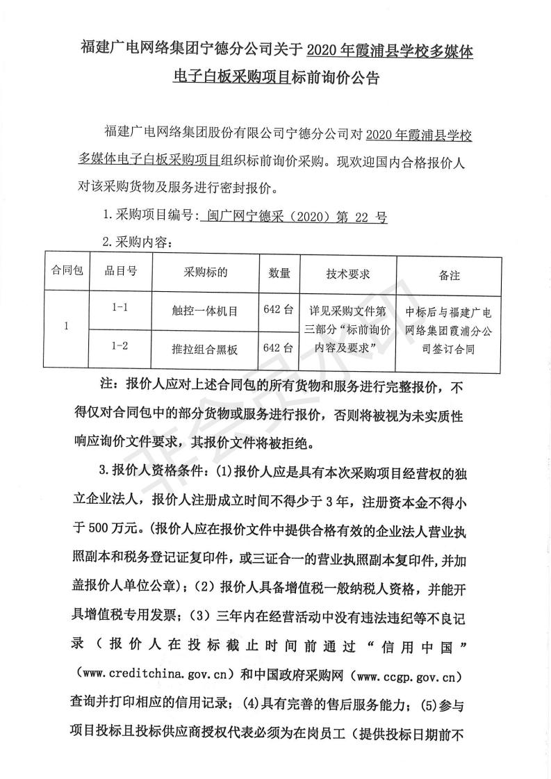 2020年霞浦县学校多媒体电子白板采购项目标前询价公告