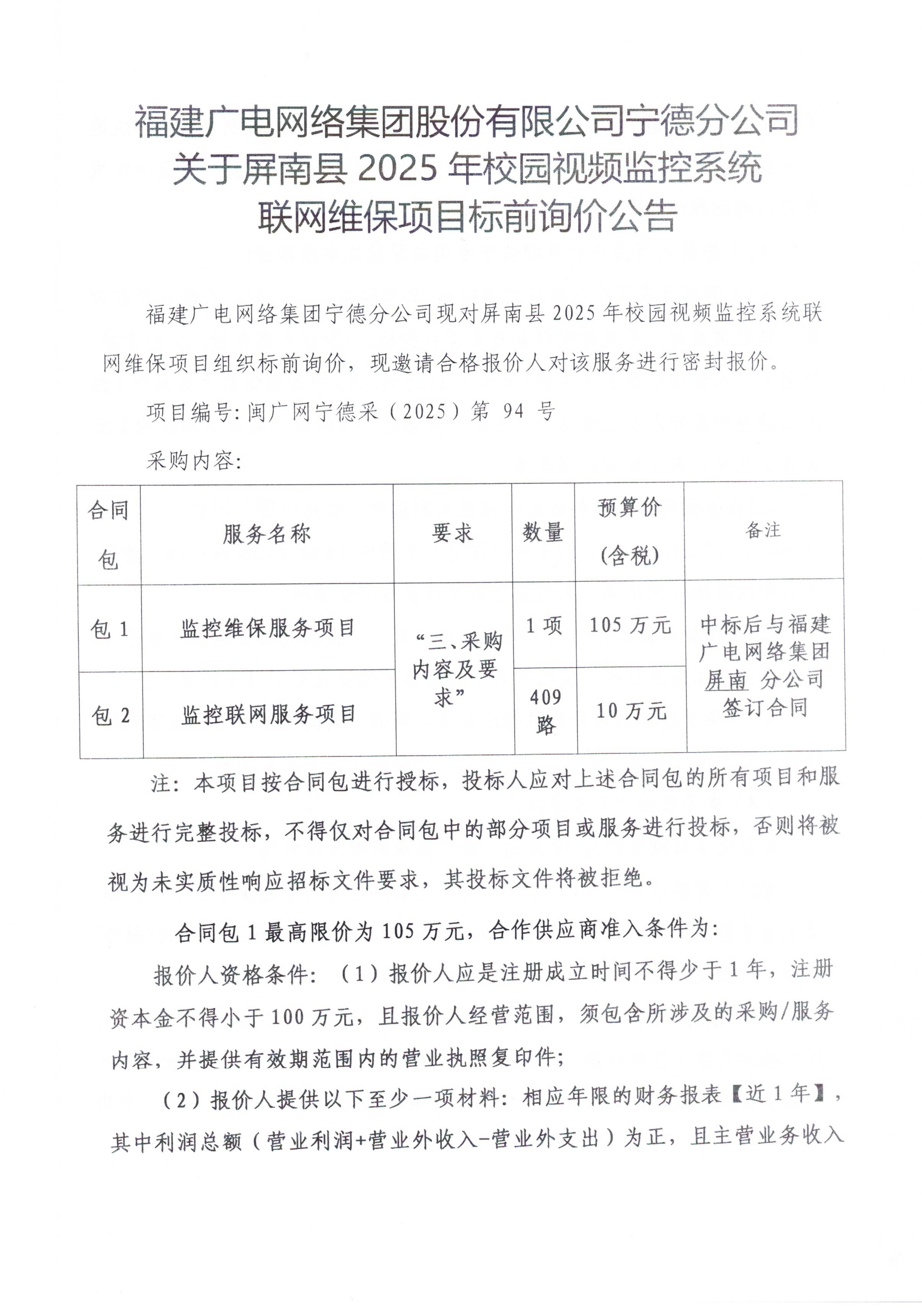 福建广电网络集团股份有限公司宁德分公司关于屏南2025年校园视频监控系统联网维保项目