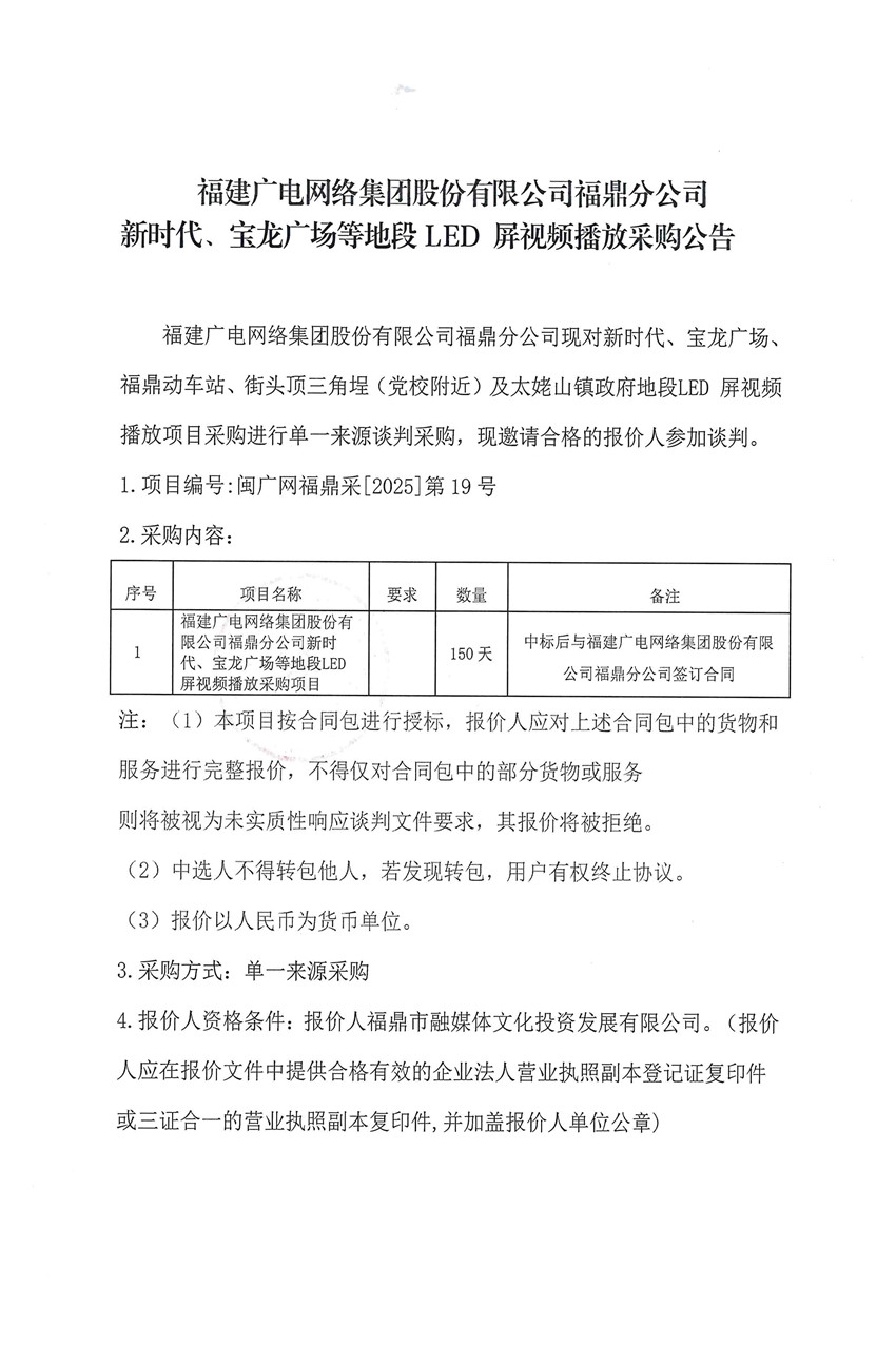 福建广电网络集团股份有限公司福鼎分公司新时代、宝龙广场等地段LED屏视频播放采购项目