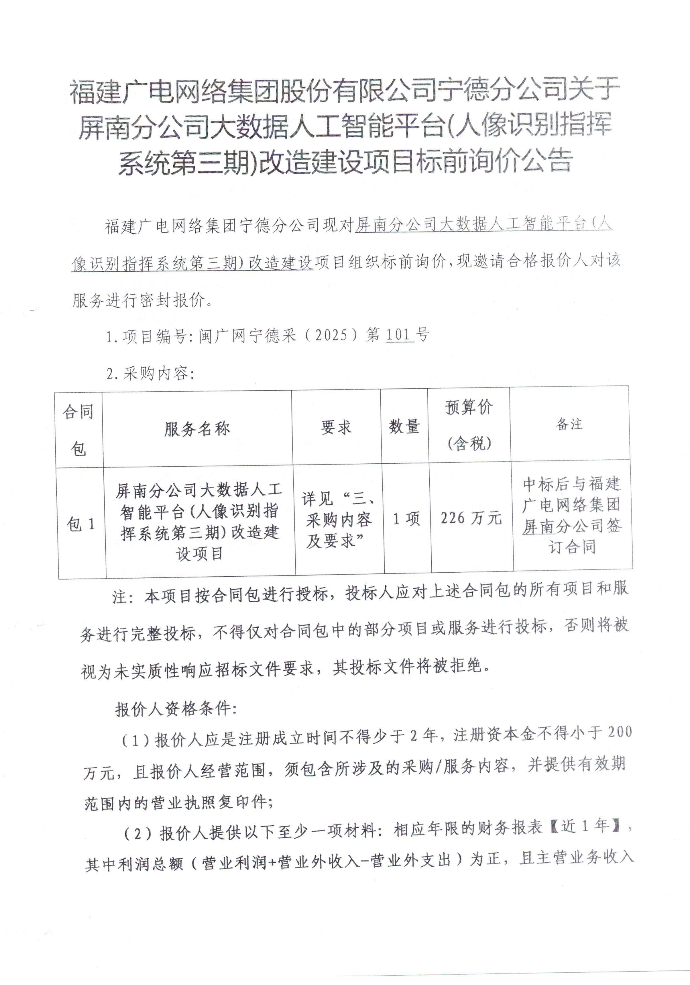 屏南分公司大数据人工智能平台(人像识别指挥系统第三期)改造建设项目