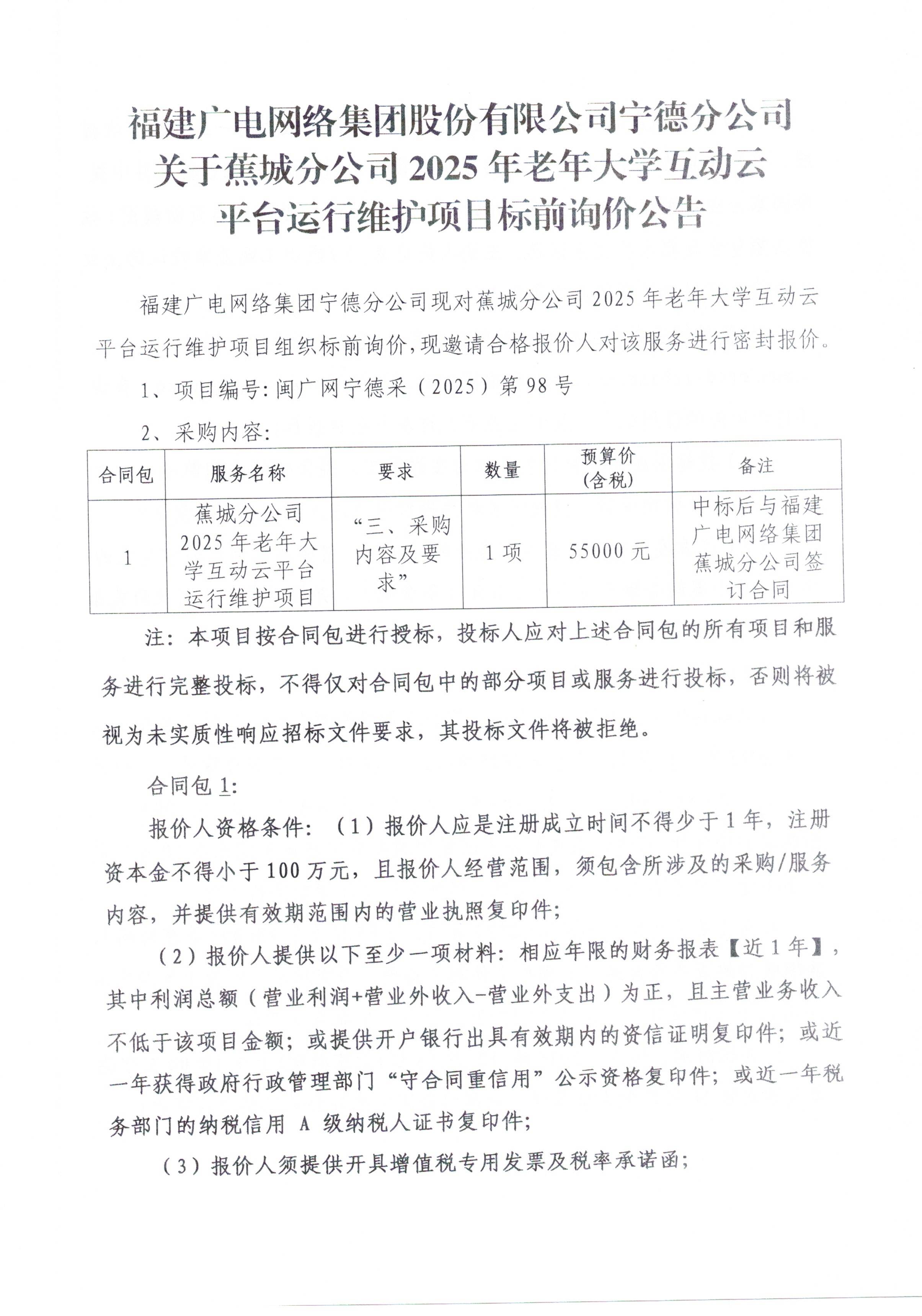 蕉城分公司老年大学互动云平台运行维护项目(标前询价)