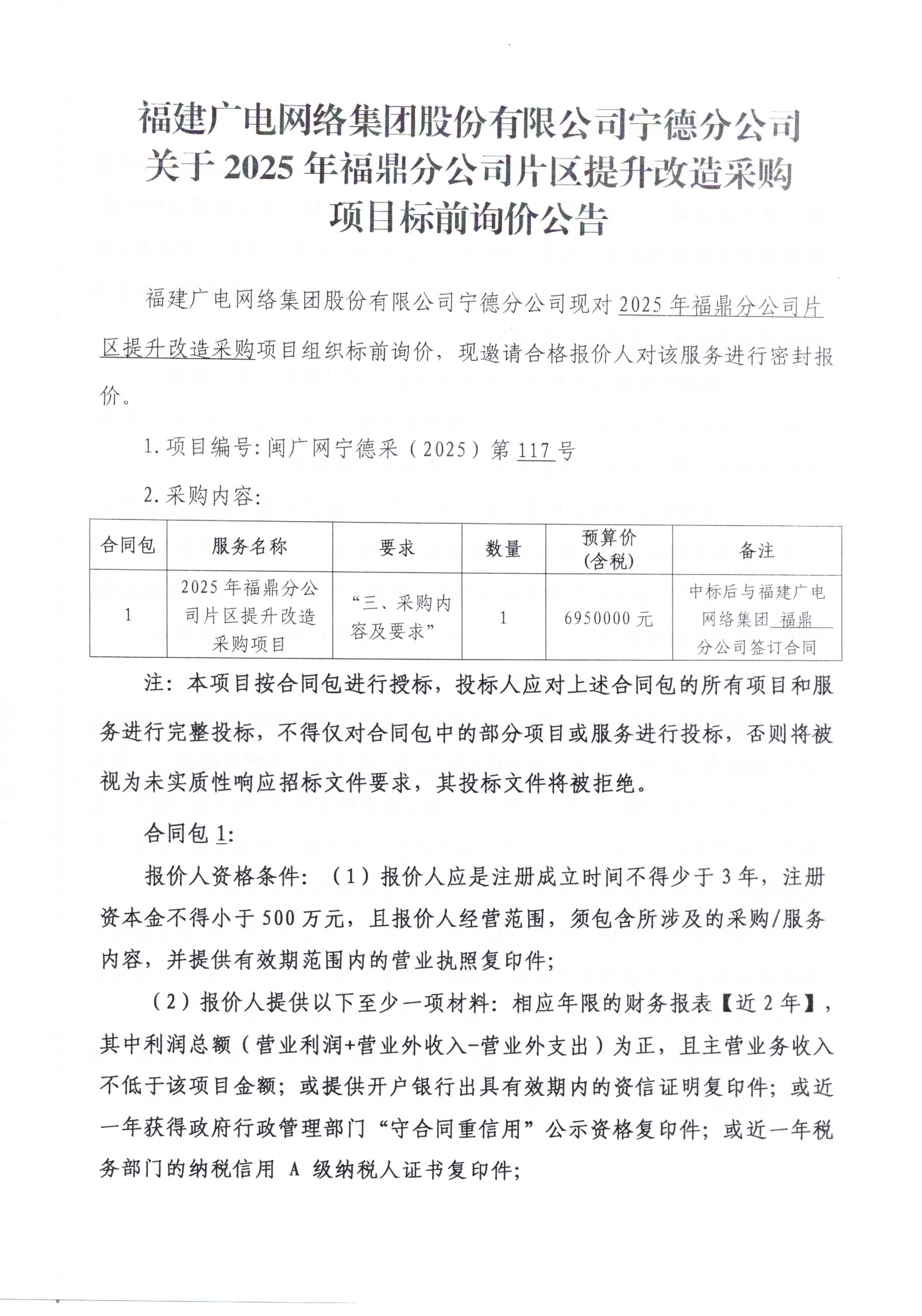 2025年福鼎分公司片区提升改造采购项目(标前询价)
