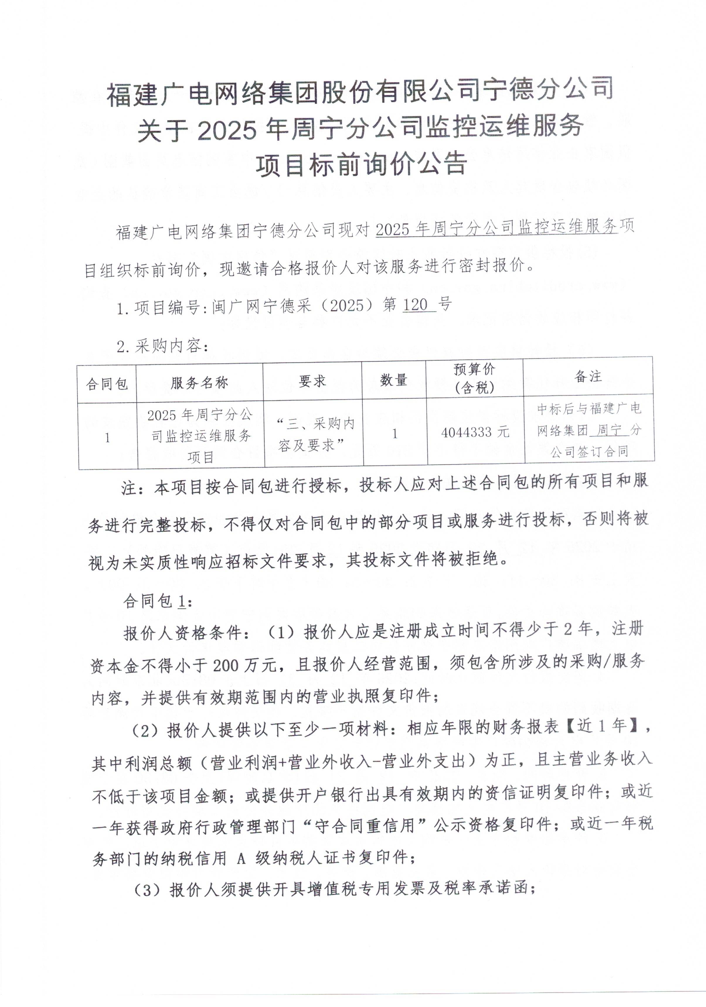 2025年周宁分公司监控运维服务项目(标前询价)