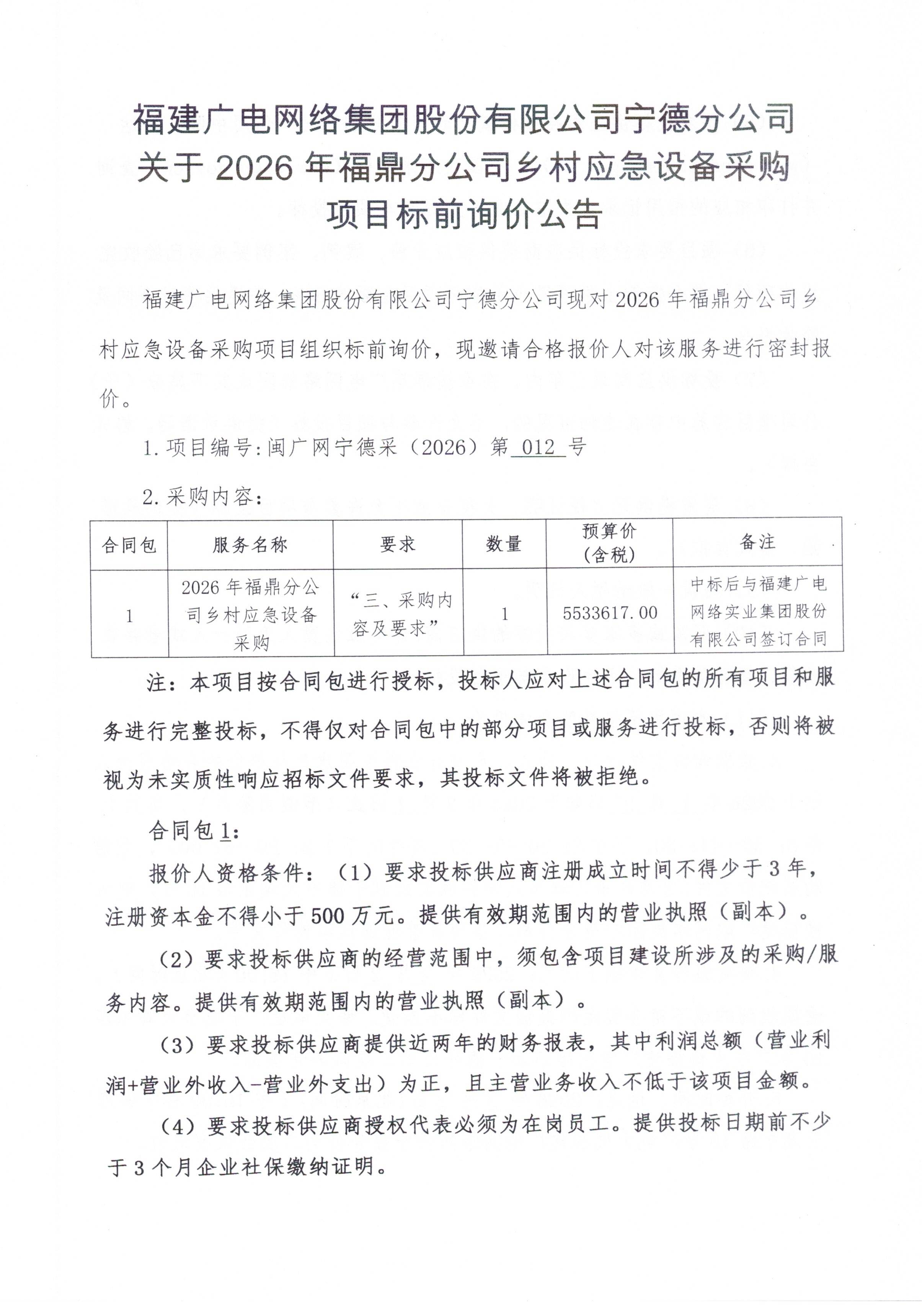 2026年福鼎分公司乡村应急设备采购项目公告(标前询价)