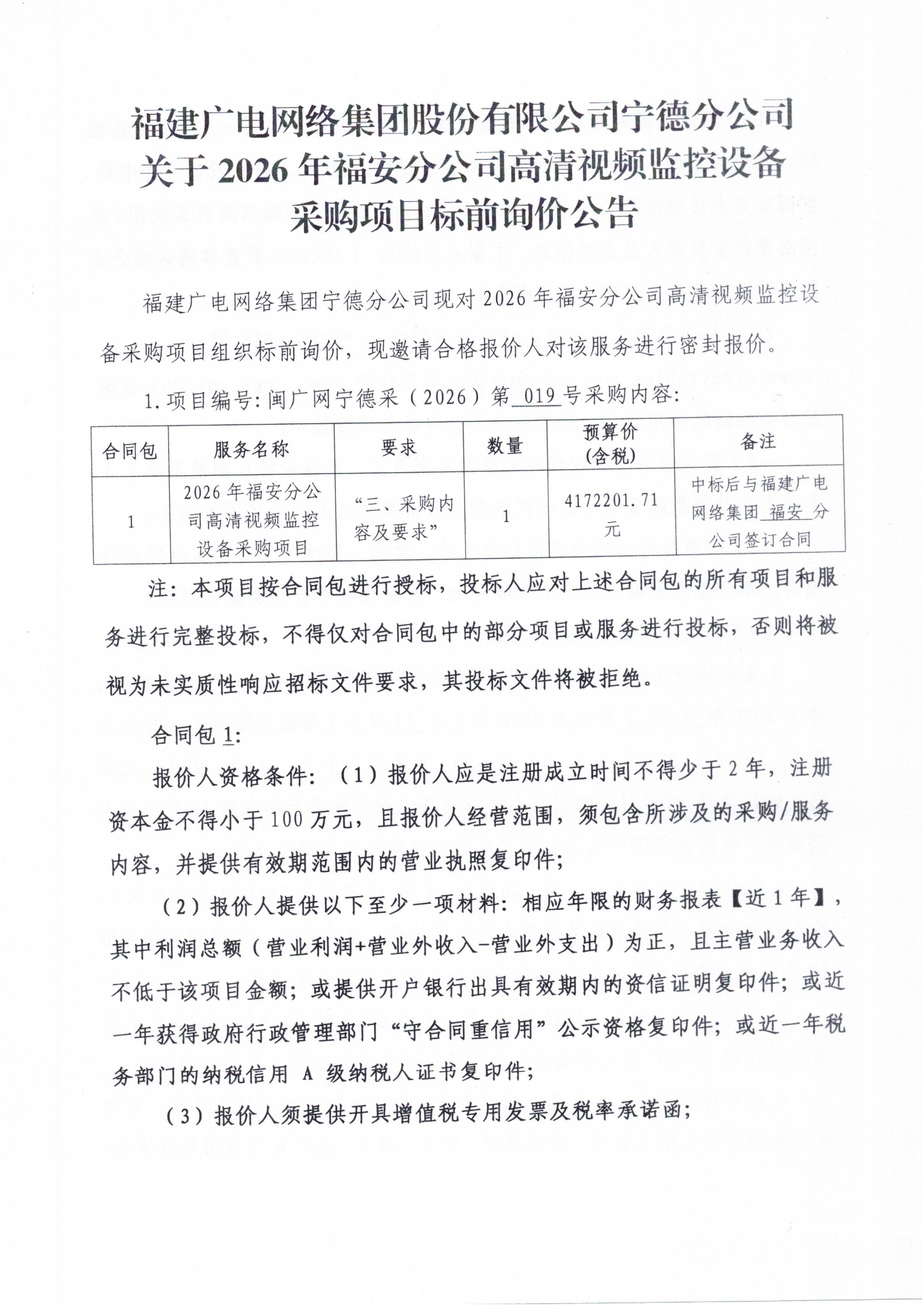 2026年福安分公司高清视频监控设备采购公告(标前询价)