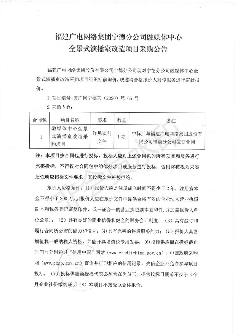 宁德分公司融媒体中心全景式演播室改造项目采购公告