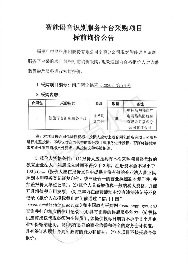 智能语音识别服务平台采购项目标前询价公告