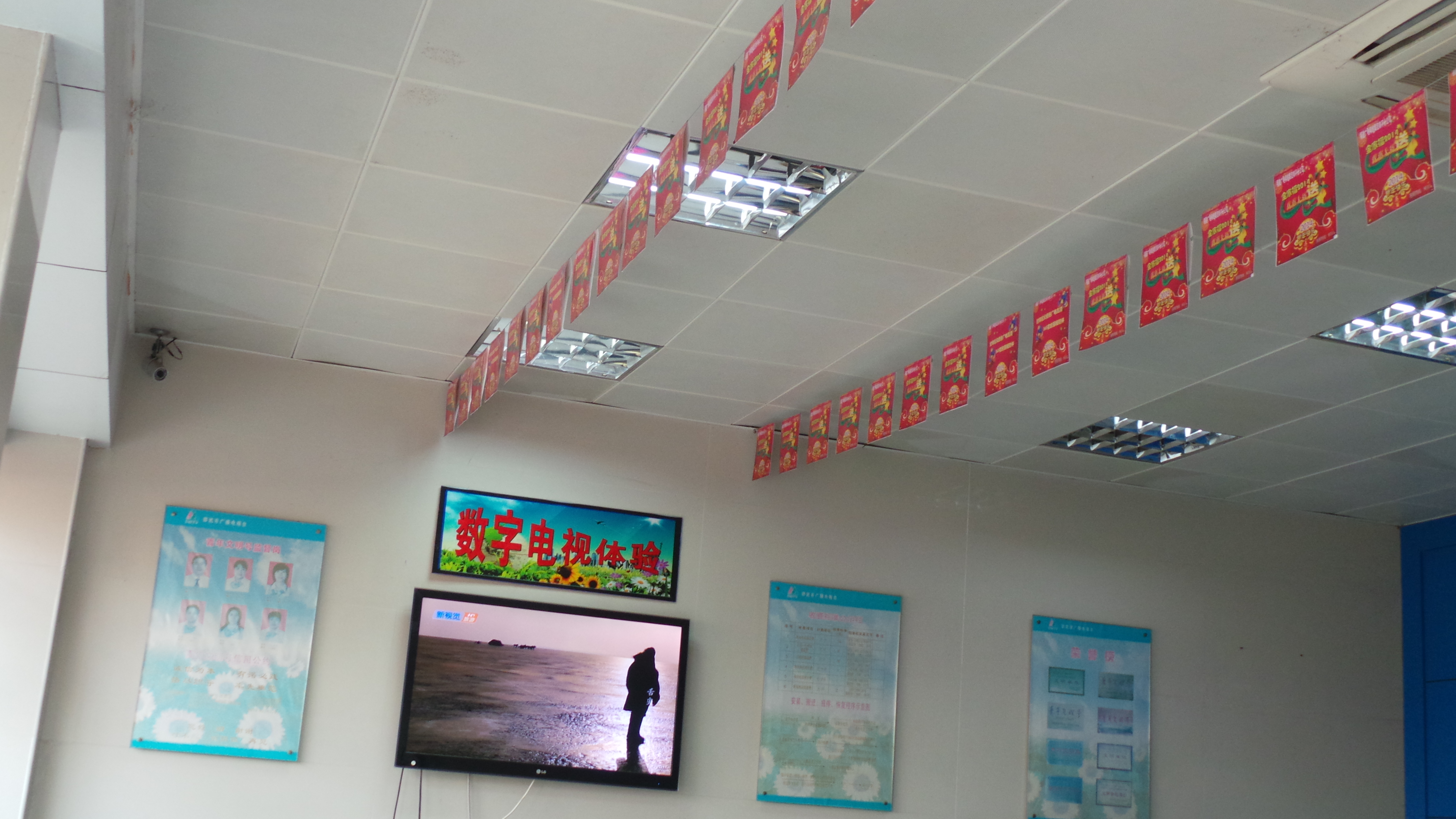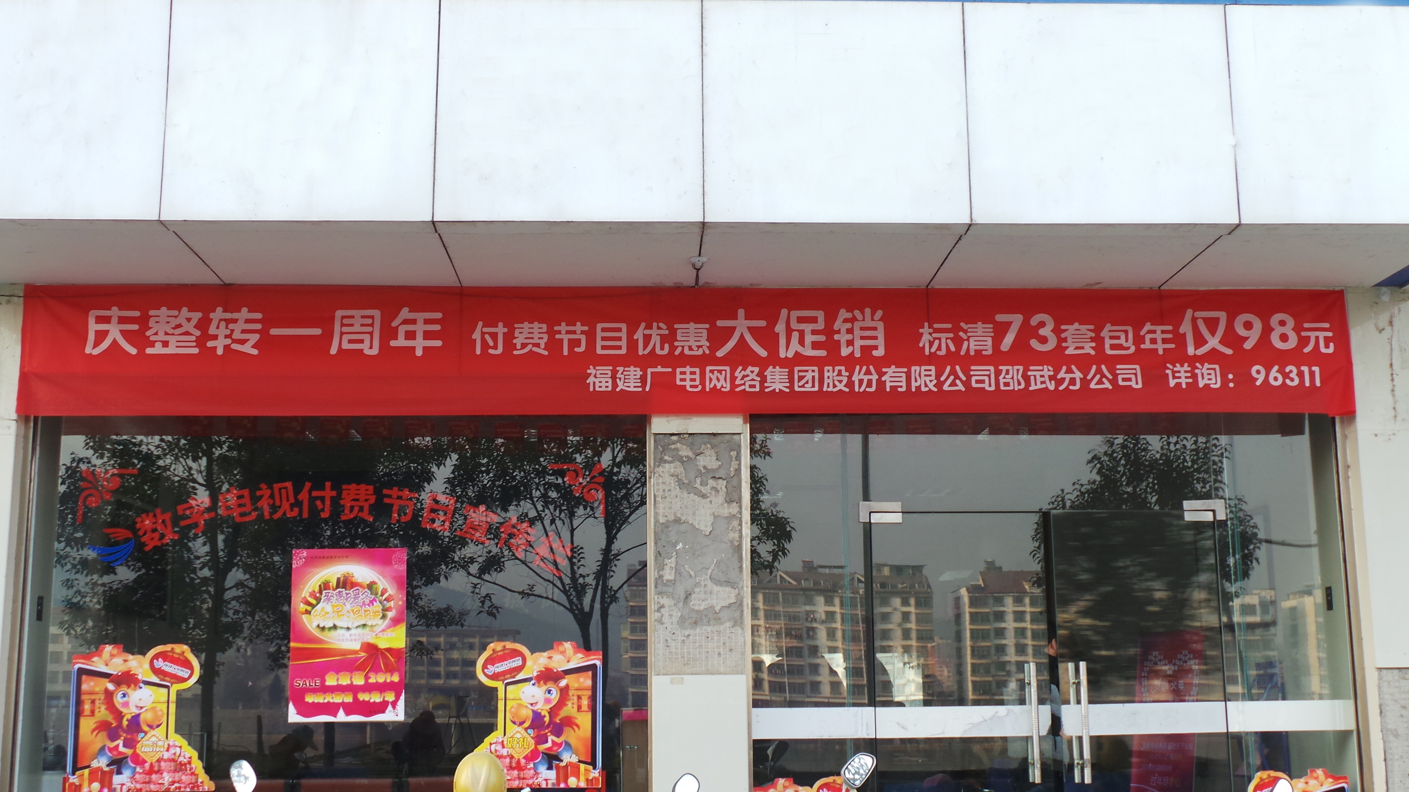 新年新气象,为在元旦期间更好的服务广大用户,营造喜庆的节日营销氛围,邵武分公司将各营业窗口装扮一新,提升了整体视觉效果,同时结合业务推广需要,在营业厅外设立数字电视付费节目宣传栏,张贴“聚惠暖冬,给足温暖,全家福2014”优惠活动海报,厅内摆放着宣传“过年尽孝心 就送广电高清”的展板,天花板上也高高悬挂着两列红色宣传彩纸。