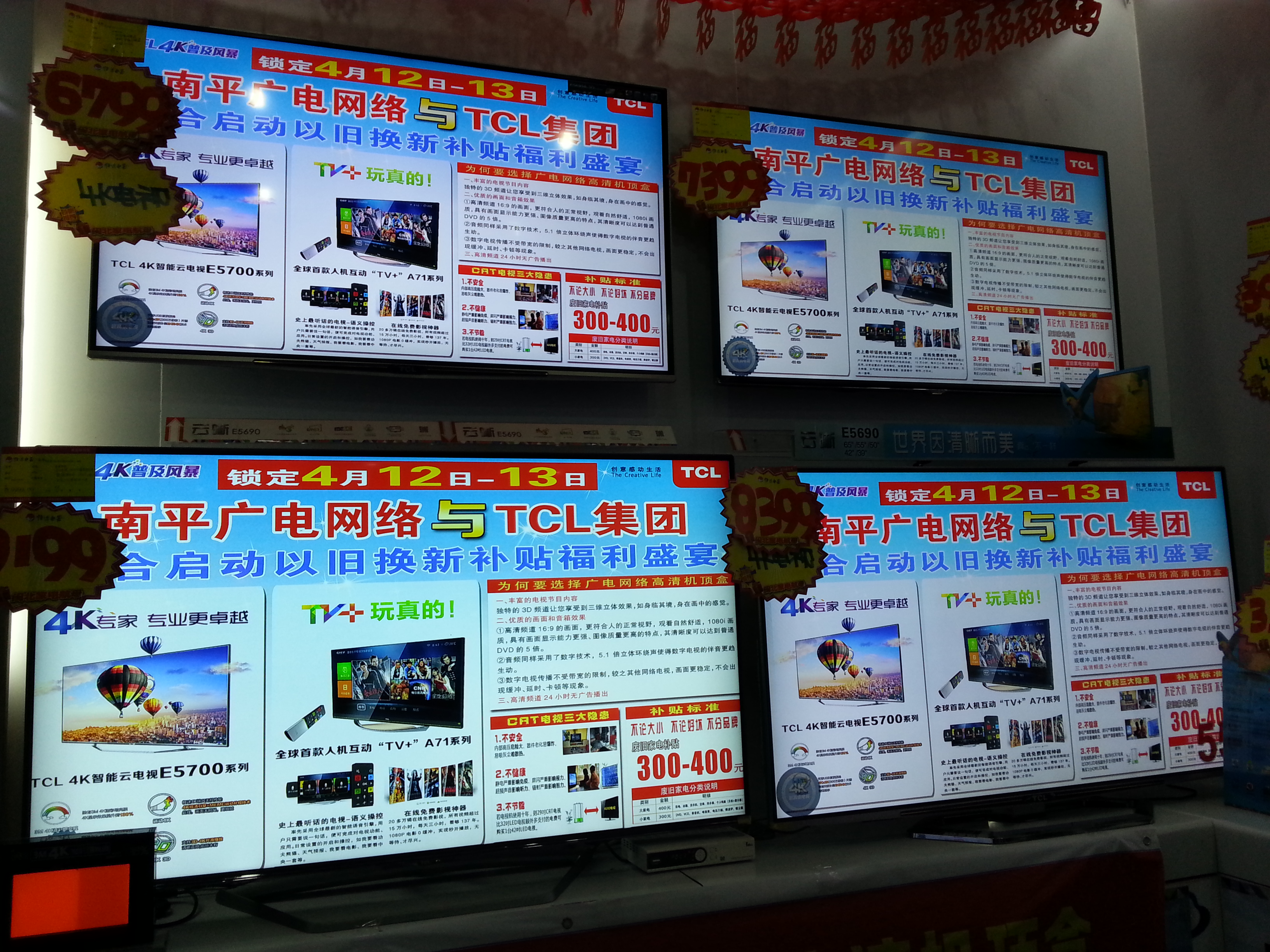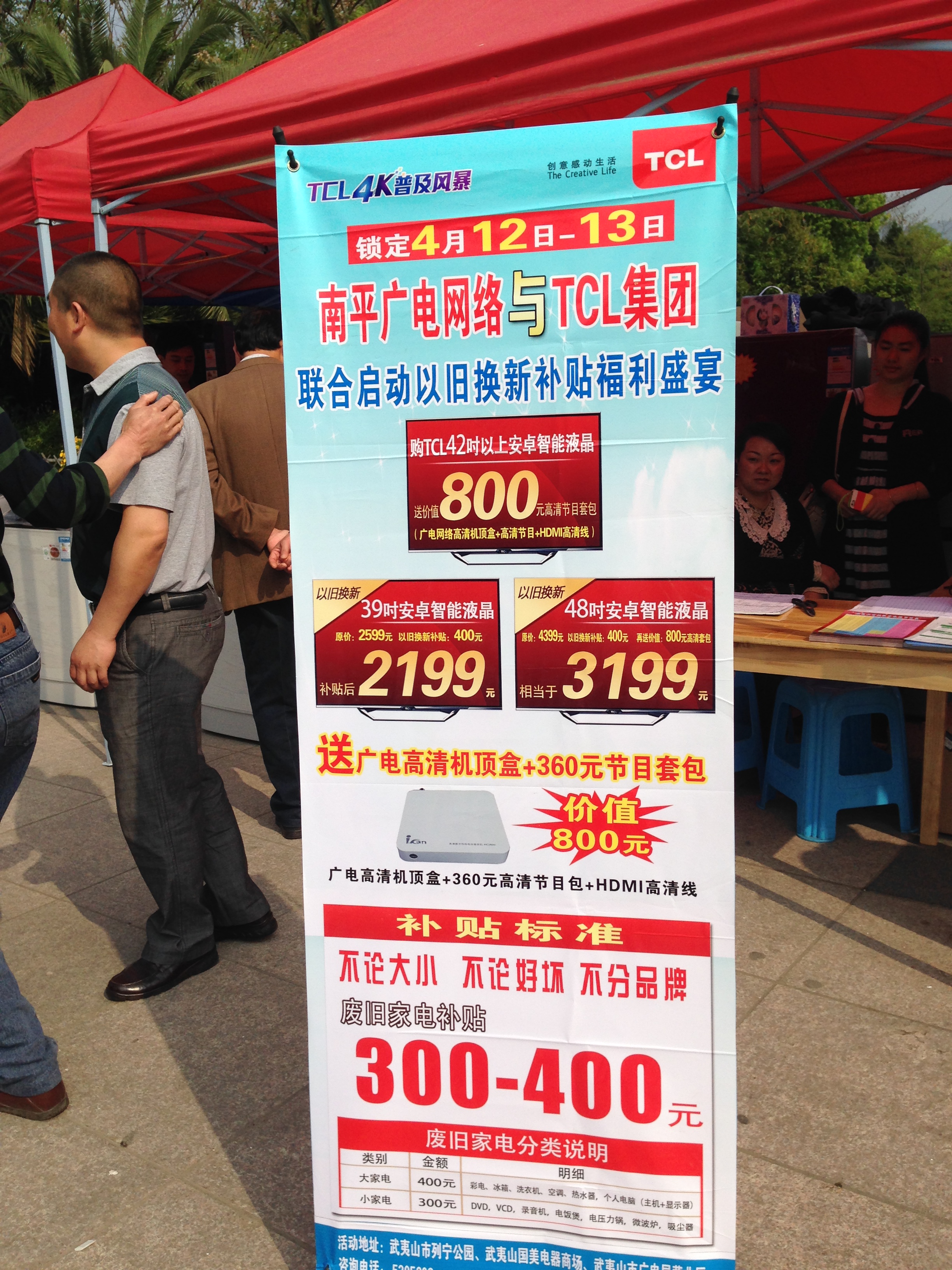 4月12日至13日,南平分公司、武夷山分公司携手TCL集团在南平市文化广场、恒达电器商城、武夷山列宁公园启动以旧换新补贴福利盛宴。采取买电视送高清机顶盒、加送高清节目包的方式,联手TCL家电以旧换新活动,大力宣传数字电视政策,积极开展付费节目营销活动。两天共办理高清数字电视业务48台,共发出彩页宣传单三万多份,起到了很好的宣传效果。