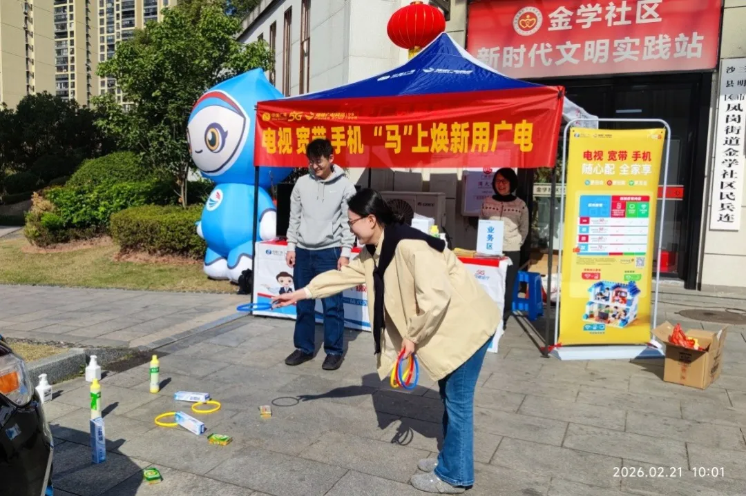 在富兴广场小区设立便民服务台,提供业务咨询、故障排查服务,结合投壶、大转盘等游戏,便民又暖心。
