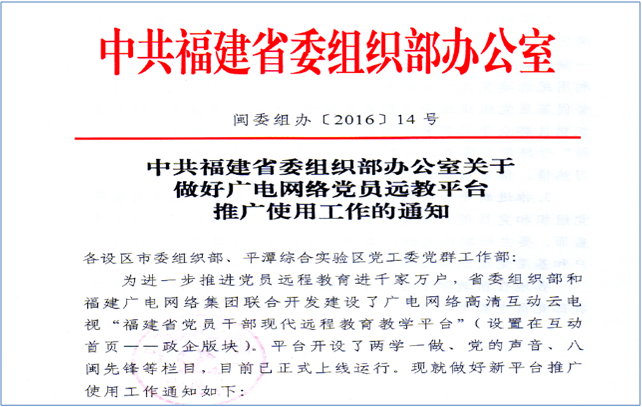 与省委组织部合作,借助省组下发的相关政策文件,基于高清互动云电视平台和电视路由系统,搭建福建省党员干部现代远程教育平台。各地市分平台对接各级市县组织部门,为各级市县组织部门提供个性化党员教育门户系统。