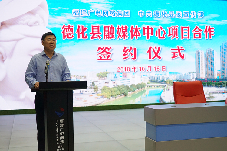 10月16日上午,德化县融媒体中心建设项目合作举行签约仪式,率先在全省启动融媒体中心规范建设。集团副总经理梁章林、中共德化县委常委宣传部长陈坚宏、泉州分公司党委书记、总经理温志加以及德化县广电局、德化报、德化网等新闻媒体负责人参加签约仪式。